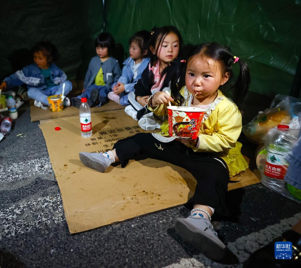 9月5日晚,在四川甘孜州瀘定縣磨西鎮(zhèn)的受災(zāi)群眾臨時安置點,幾個家庭的孩子們在一個帳篷里吃飯、休息。新華社 沈伯韓 攝