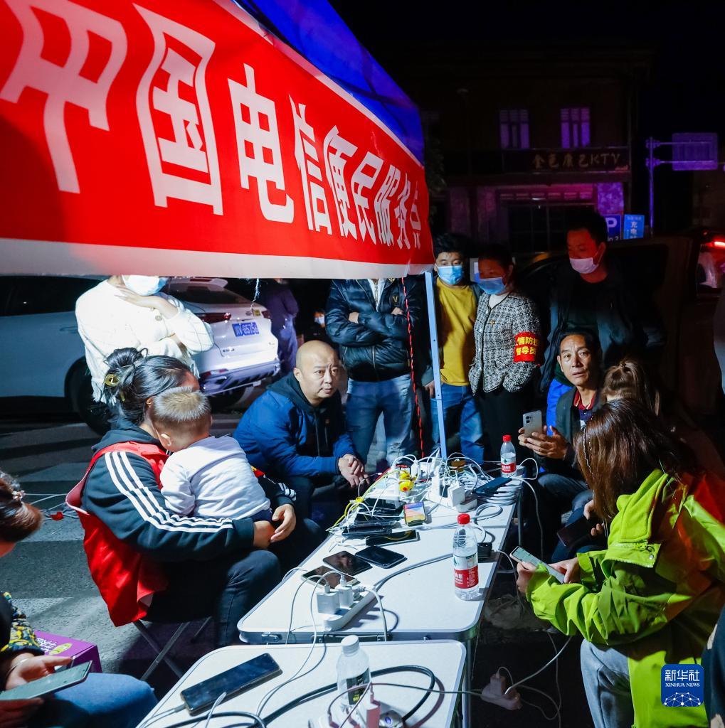 9月5日晚,在四川甘孜州瀘定縣磨西鎮(zhèn)的受災(zāi)群眾臨時安置點,人們在中國電信便民服務(wù)點為手機充電。新華社 沈伯韓 攝