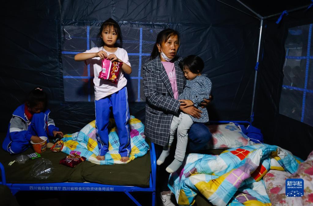 9月5日晚,在四川甘孜州瀘定縣磨西鎮(zhèn)的受災(zāi)群眾臨時安置點,受災(zāi)群眾在帳篷里。新華社 沈伯韓 攝
