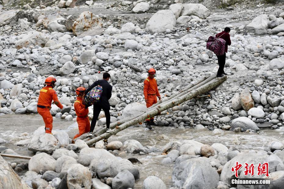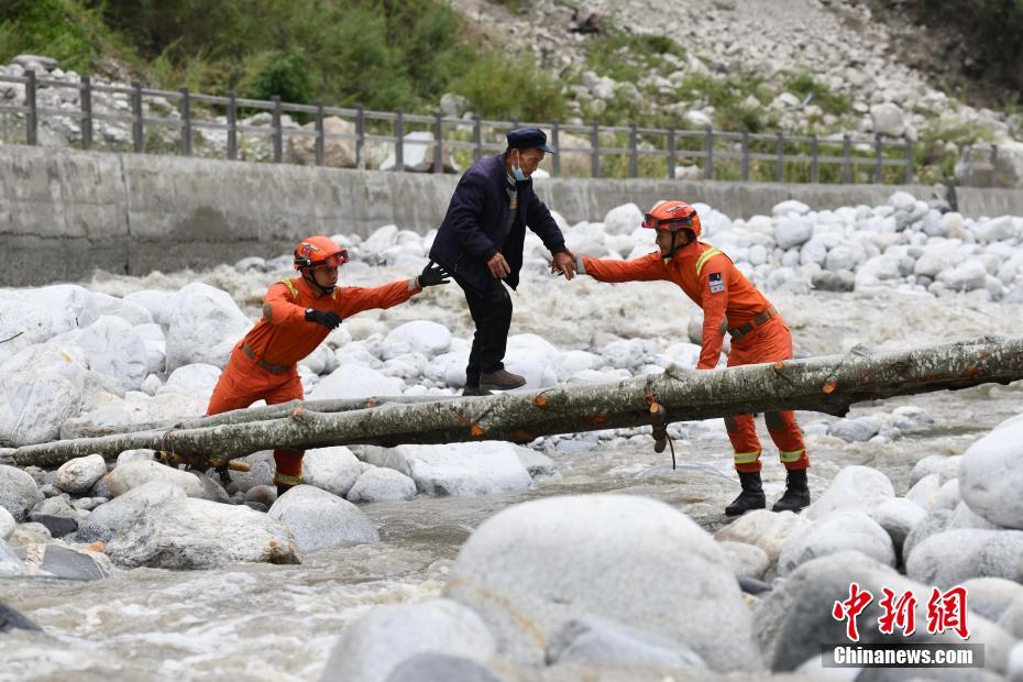 9月6日,四川甘孜州瀘定縣磨西鎮(zhèn),甘孜州森林消防支隊康定中隊隊員在木橋旁護送村民。 中新社記者 張浪 攝