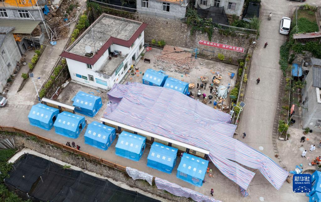 9月7日,在雅安市石棉縣王崗坪彝族藏族鄉(xiāng)幸福村村委會(huì)小廣場(chǎng),村民們搭起帳篷吃住在一起(無(wú)人機(jī)照片)。新華社記者 才揚(yáng) 攝