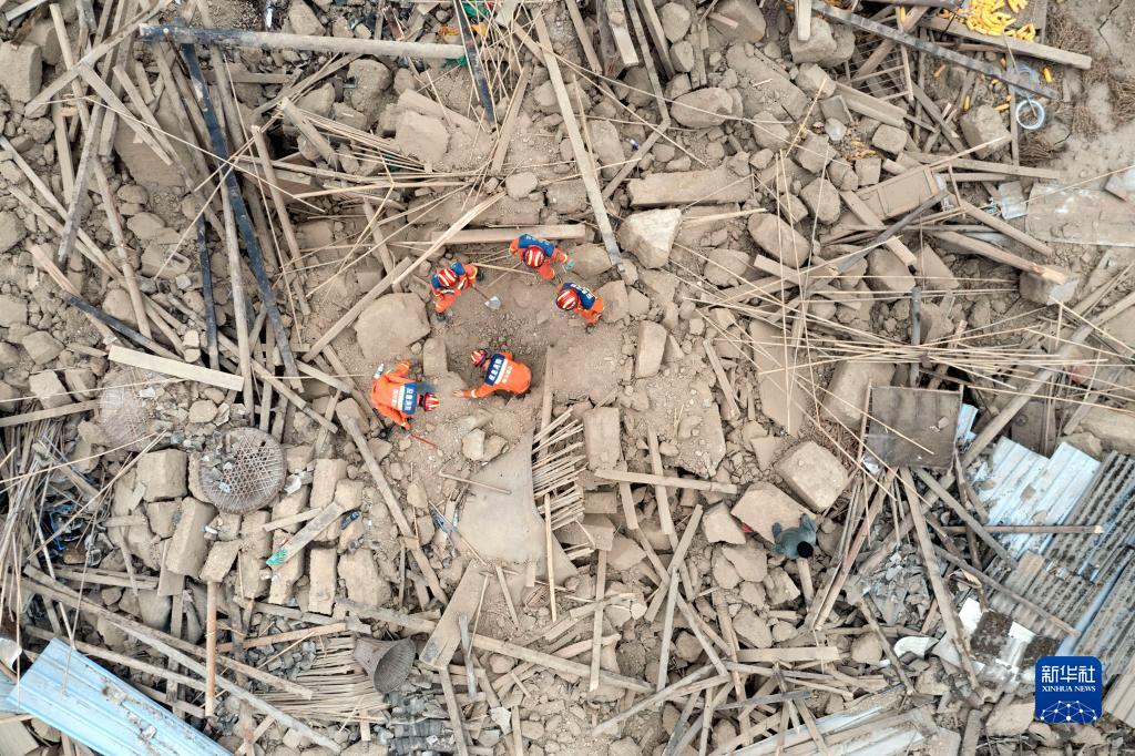 9月7日,在雅安市石棉縣王崗坪彝族藏族鄉(xiāng)幸福村二組,四川眉山消防救援隊(duì)隊(duì)員幫助村民在倒塌的房屋中找尋物品(無(wú)人機(jī)照片)。新華社記者 才揚(yáng) 攝