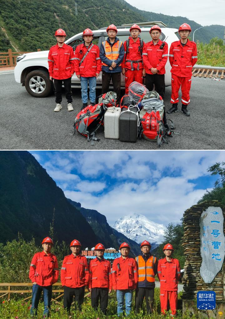 這是一張拼版照片,上圖為:9月7日,四川省冶勘設(shè)計(jì)集團(tuán)有限公司的6名調(diào)查隊(duì)員在搭乘直升機(jī)去往海螺溝前拍攝的合影(新華社記者沈伯韓攝);下圖為:9月10日,6名調(diào)查隊(duì)員在海螺溝景區(qū)一號(hào)營地拍攝的合影(四川省冶勘設(shè)計(jì)集團(tuán)有限公司供圖)。新華社發(fā)