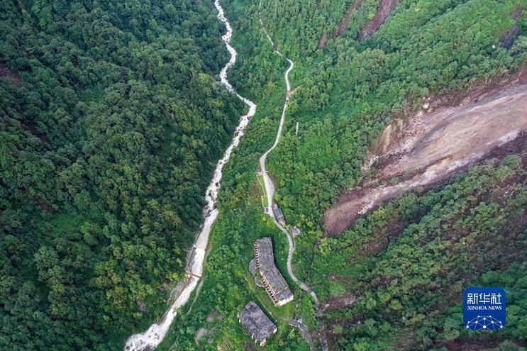 這是9月7日拍攝的海螺溝景區(qū)一號(hào)營地下游處的崩塌災(zāi)害現(xiàn)場(左上部分)(無人機(jī)照片)。新華社發(fā)(四川省冶勘設(shè)計(jì)集團(tuán)有限公司供圖)