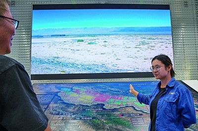 龍羊峽水光互補發(fā)電站的講解員楊若怡向來賓介紹當?shù)厣鷳B(tài)逐漸向好的過程。