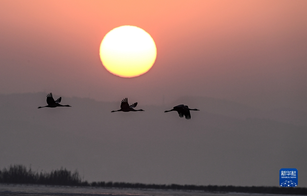 在貴州草海國家級自然保護(hù)區(qū)迎著朝陽起飛的黑頸鶴(2021年1月13日攝)。新華社記者 楊文斌 攝