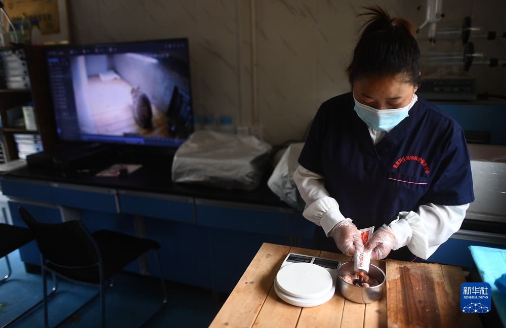 9月18日,青海野生動(dòng)物救護(hù)繁育中心工作人員虎文蓉在給荒漠貓準(zhǔn)備的晚餐中加入營養(yǎng)膏。新華社記者 張宏祥 攝