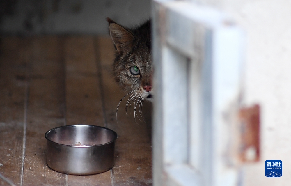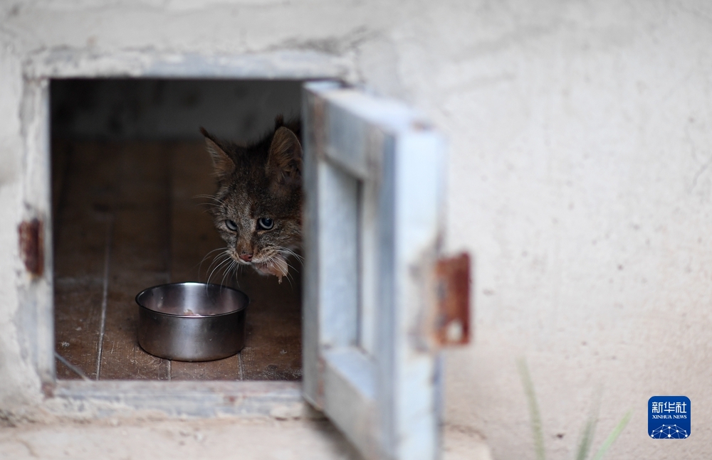 9月18日,受救護(hù)的荒漠貓?jiān)谇嗪R吧鷦?dòng)物救護(hù)繁育中心進(jìn)食。新華社記者 張宏祥 攝