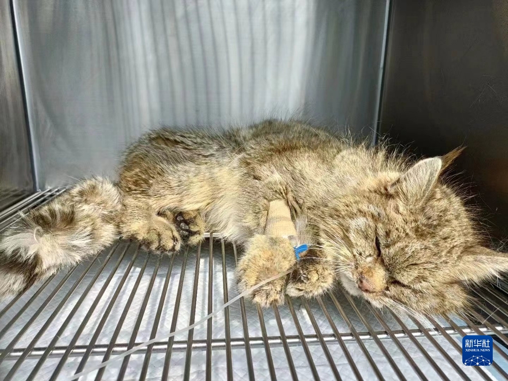 2022年3月21日,受救護(hù)的荒漠貓?jiān)谇嗪R吧鷦?dòng)物救護(hù)繁育中心接受治療。新華社發(fā)(青海野生動(dòng)物救護(hù)繁育中心供圖)