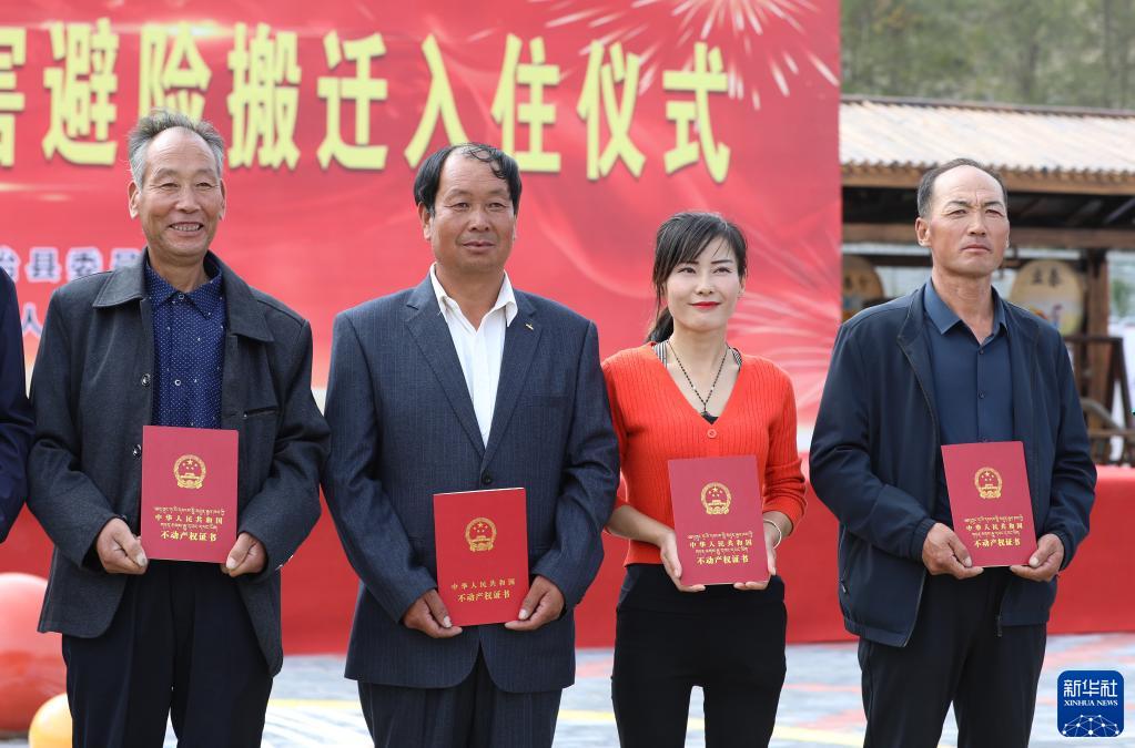 9月15日,在甘肅省武威市天祝藏族自治縣生態(tài)及地質(zhì)災(zāi)害避險(xiǎn)搬遷入住儀式上,祁連鎮(zhèn)116戶群眾拿到不動產(chǎn)權(quán)證書,入住新房。作為生態(tài)脆弱地區(qū),天祝縣通過生態(tài)及地質(zhì)災(zāi)害避險(xiǎn)搬遷工作,嘗試解決地質(zhì)災(zāi)害威脅和發(fā)展受限問題。