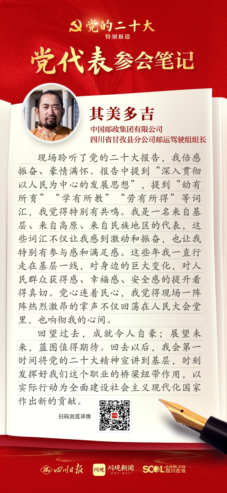 出席盛會(huì),來自四川的黨代表深感使命光榮、責(zé)任重大,大家認(rèn)真履職,結(jié)合報(bào)告談?wù)J識(shí)、談體會(huì)、談打算。川觀新聞特此推出“黨代表參會(huì)筆記”欄目,分享黨代表們的參會(huì)心得,敬請(qǐng)垂注。