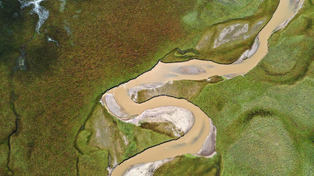 游客在甘肅省甘南藏族自治州瑪曲縣河曲馬場(chǎng)的濕地游覽(2019年6月22日攝,無(wú)人機(jī)照片)。新華社記者 陳斌 攝