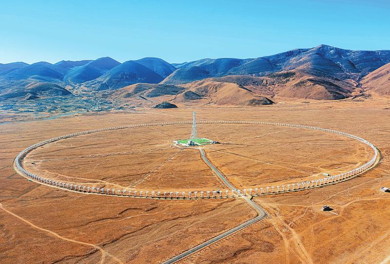 這是一個由313臺直徑6米、形似鍋蓋的天線構成的綜合孔徑射電望遠鏡。天線均勻分布在直徑1公里的圓環(huán)上,由圓環(huán)中心100米高的定標塔為整個觀測鏈路提供定標基準,狀如一顆巨大的“千眼天珠”。