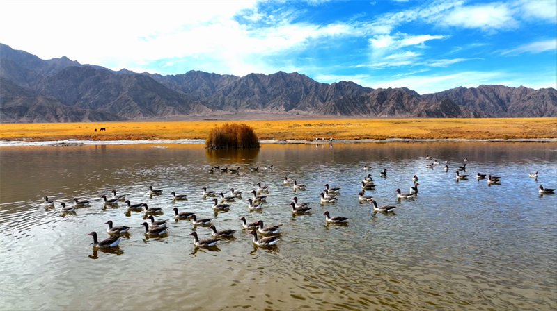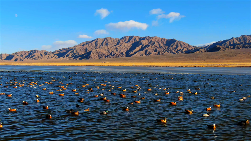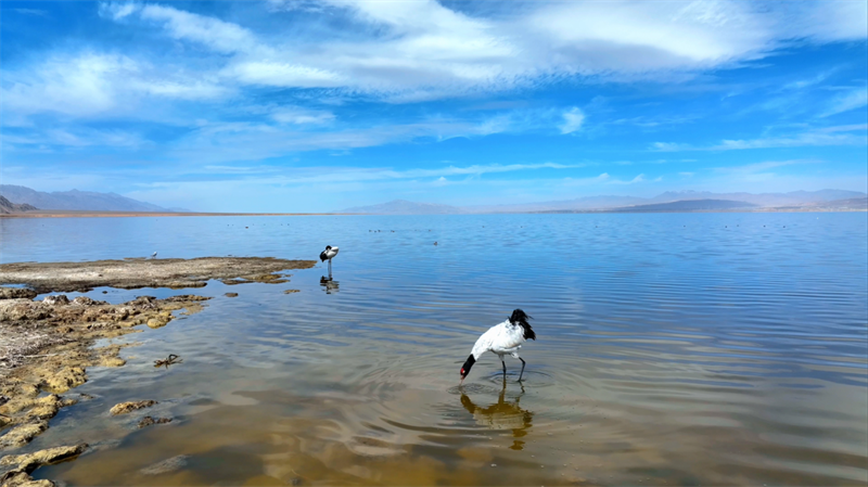 初冬時節(jié),在青海省海西蒙古族藏族自治州烏蘭縣都蘭湖國家濕地公園內,四只國家一級保護動物黑頸鶴,踏著黑色細長的腿在湖中閑庭信步,與斑頭雁、赤麻鴨一起嬉戲覓食,盡顯柴達木盆地濕地生態(tài)之美。