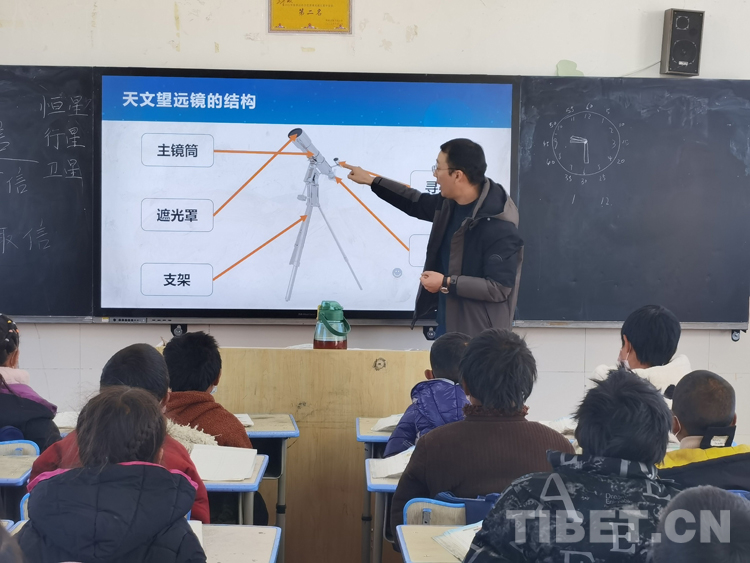 11月30日,王建煜受邀來(lái)到海拔4300多米的騾子溝小學(xué),帶著天文設(shè)備為牧區(qū)孩子們上了一節(jié)望遠(yuǎn)鏡觀測(cè)入門課。王建煜通過(guò)PPT展示了豐富的天文社團(tuán)活動(dòng),引起了孩子們強(qiáng)烈的好奇心和探索心。他介紹到,要想觀測(cè)到遙遠(yuǎn)的地方,必須要借助工具,而天文望遠(yuǎn)鏡,就是我們觀測(cè)星空的工具。