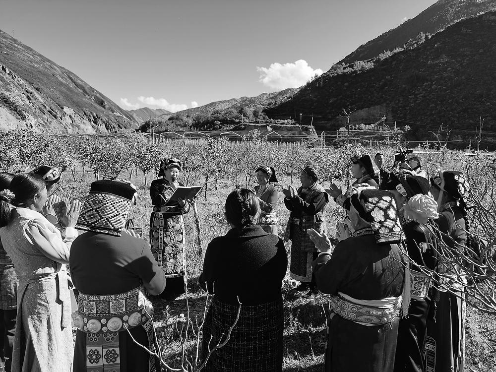 陳望慧(圖中)在勞動(dòng)間隙向藏族群眾宣講黨的二十大精神。金宣 攝