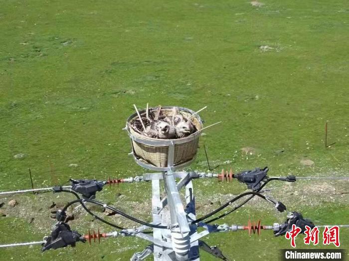 圖為高原猛禽在人工鳥巢內(nèi)“安家”。 國(guó)網(wǎng)青海省電力公司供圖