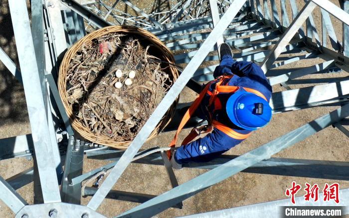 圖為國(guó)網(wǎng)青海省電力公司工作人員正在檢查人工鳥巢的情況。國(guó)網(wǎng)青海省電力公司供圖