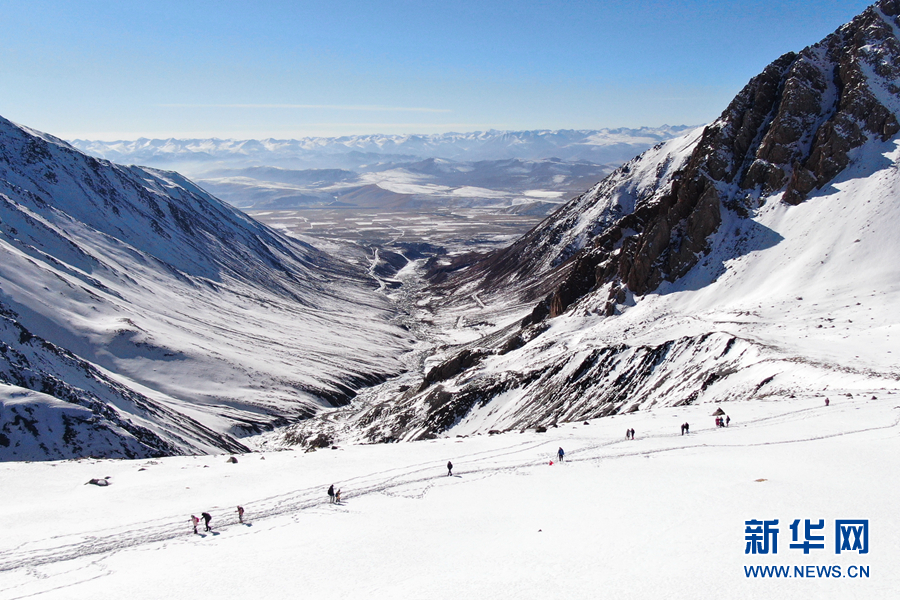 2022年1月1日,登山愛好者攀登崗什卡雪峰(無人機(jī)照片)。新華社記者 張龍攝