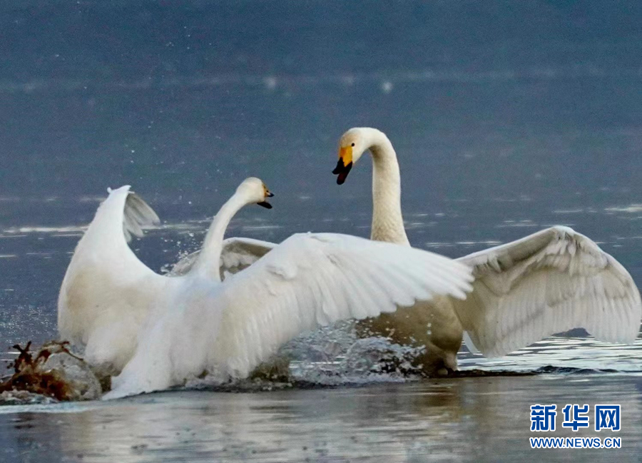 兩只大天鵝在水面嬉戲。新華網(wǎng)發(fā)(李玉峰 攝)