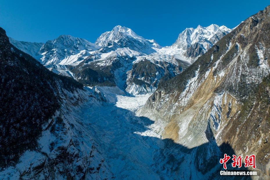 1月9日,中新網(wǎng)記者走進(jìn)四川瀘定海螺溝景區(qū)核心區(qū),航拍經(jīng)歷了2022年“9.5”瀘定6.8級地震的貢嘎山海螺溝冰川冰瀑布,雄偉壯觀依舊。