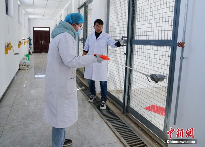 圖為1月18日,在青海省祁連山國(guó)家公園野生動(dòng)物救護(hù)繁育站,李全亮和徐豐奕(左)準(zhǔn)備給動(dòng)物們投食。 中新社記者 馬銘言 攝