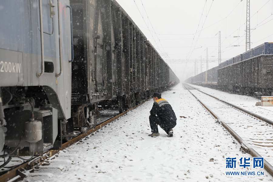 列檢人員對(duì)貨運(yùn)列車進(jìn)行檢查。新華網(wǎng) 馬建林 攝