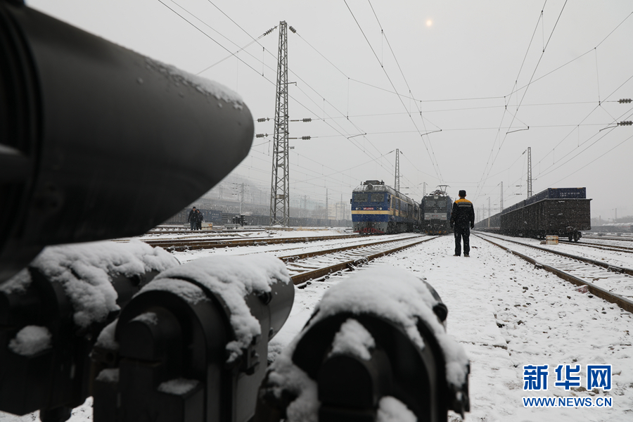 調(diào)車人員在雪中進(jìn)行調(diào)車作業(yè)。新華網(wǎng) 鐵萬(wàn)鋼 攝