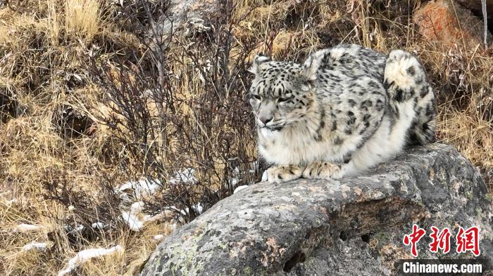 得知情況后,年保玉則景區(qū)管理局立即派員前往現場察看,歷經連續(xù)三天的追蹤足跡和蹲點守候,終于在索乎日麻鄉(xiāng)境內一處海拔4500米的巖石區(qū)內,用無人機拍攝到兩只成年雪豹的清晰影像。