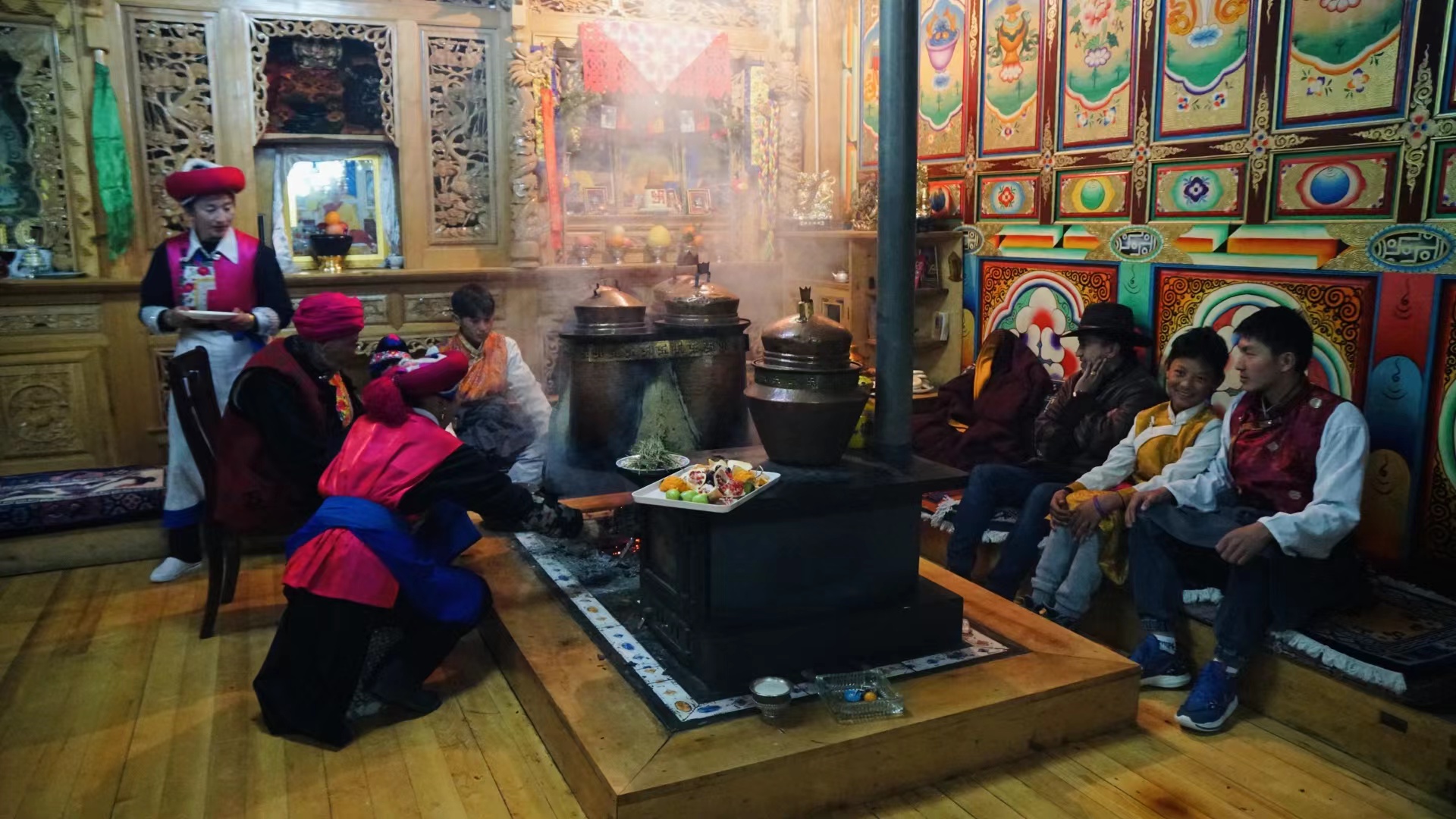 傍晚時(shí)分,“年夜飯”準(zhǔn)備完成,初稱(chēng)站在火塘邊把剛和好的稀泥一層一層地刷到火塘上,“這是藏歷新年的添新土儀式(藏歷新年接福習(xí)俗),表示我們對(duì)來(lái)年日子風(fēng)調(diào)雨順、紅紅火火的美好期待?!背醴Q(chēng)把這些傳統(tǒng)習(xí)俗認(rèn)真地教給家里的孩子們。
