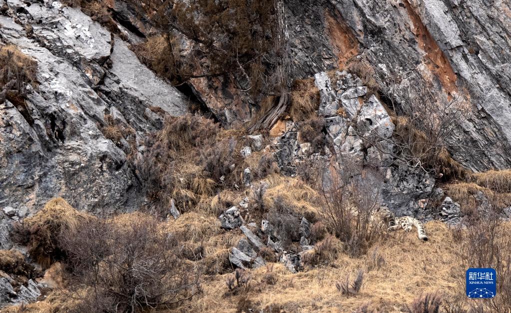2月21日,在青海省玉樹藏族自治州雜多縣昂賽鄉(xiāng)境內(nèi)的昂賽大峽谷內(nèi),一只雪豹正在休息。新華社記者 張宏祥 攝