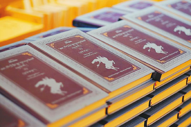 《格薩爾王全集》的裝幀,封面是比較特別的,有云紋做背景,書(shū)的背脊,一邊是書(shū)名和編號(hào),另一邊是由十余幅格薩爾唐卡拼接而成,書(shū)頁(yè)上端的空白和紙邊之間采用了金色滾邊的工藝。[詳細(xì)] -