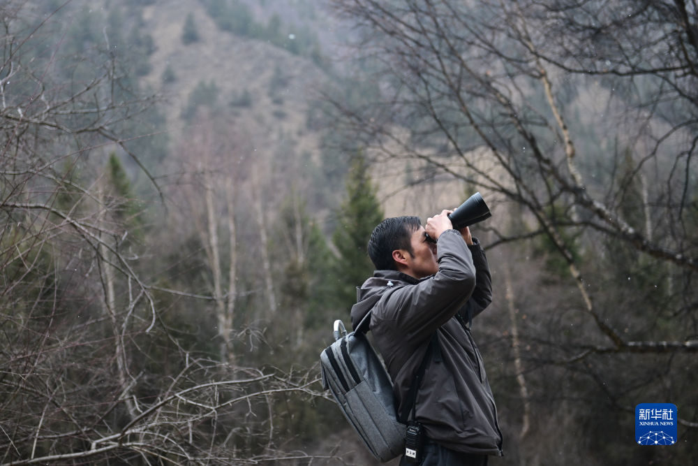 3月24日,在青海省黃南藏族自治州麥秀林場,護林員使用望遠鏡巡護林區(qū)。新華社記者 張龍 攝