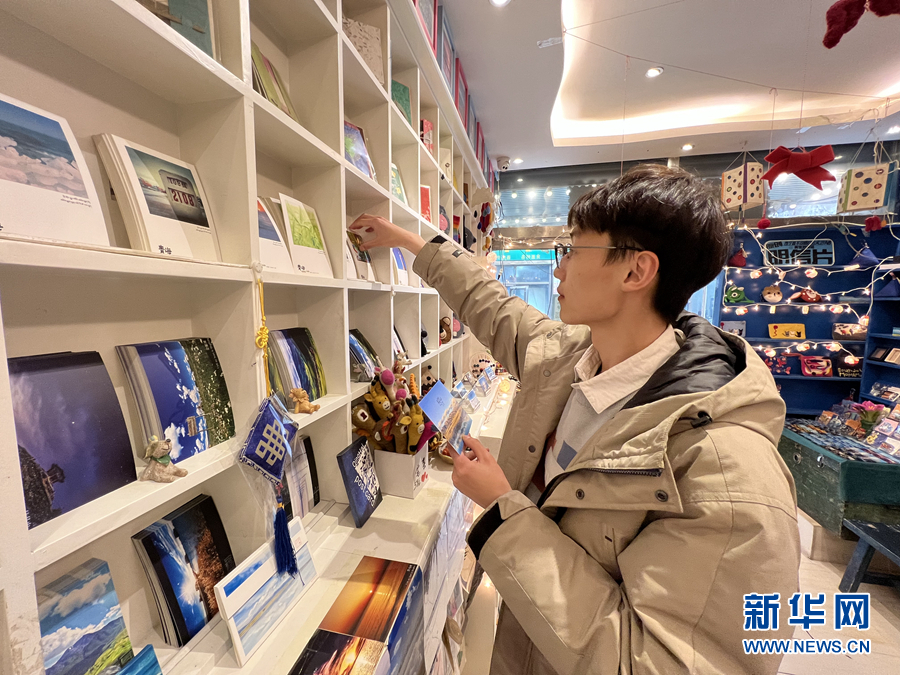 藍(lán)色的青海湖、金色的油菜花海、宛若明鏡的茶卡鹽湖……在青海省西寧市城中區(qū)莫家街一家文創(chuàng)小店里,來(lái)自山東青島的游客張開(kāi)心正在店里挑選明信片。