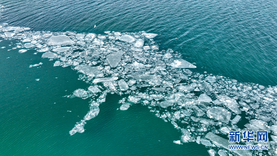 這是4月8日拍攝的青海湖開湖景觀(無人機(jī)照片)。新華網(wǎng) 宋忠勇 攝