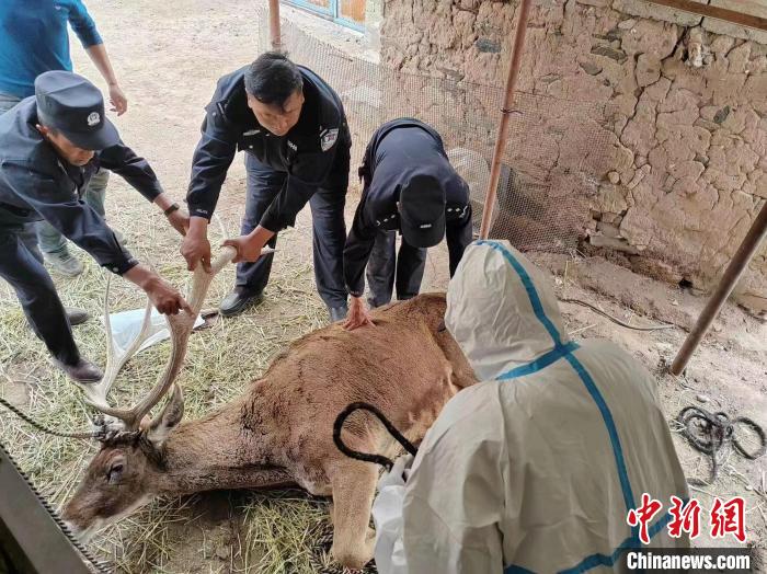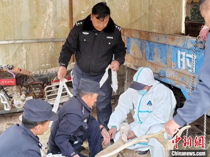 圖為民警協(xié)助鄉(xiāng)鎮(zhèn)醫(yī)生為白唇鹿處理傷口。稱多縣公安局森林警察大隊(duì)供圖