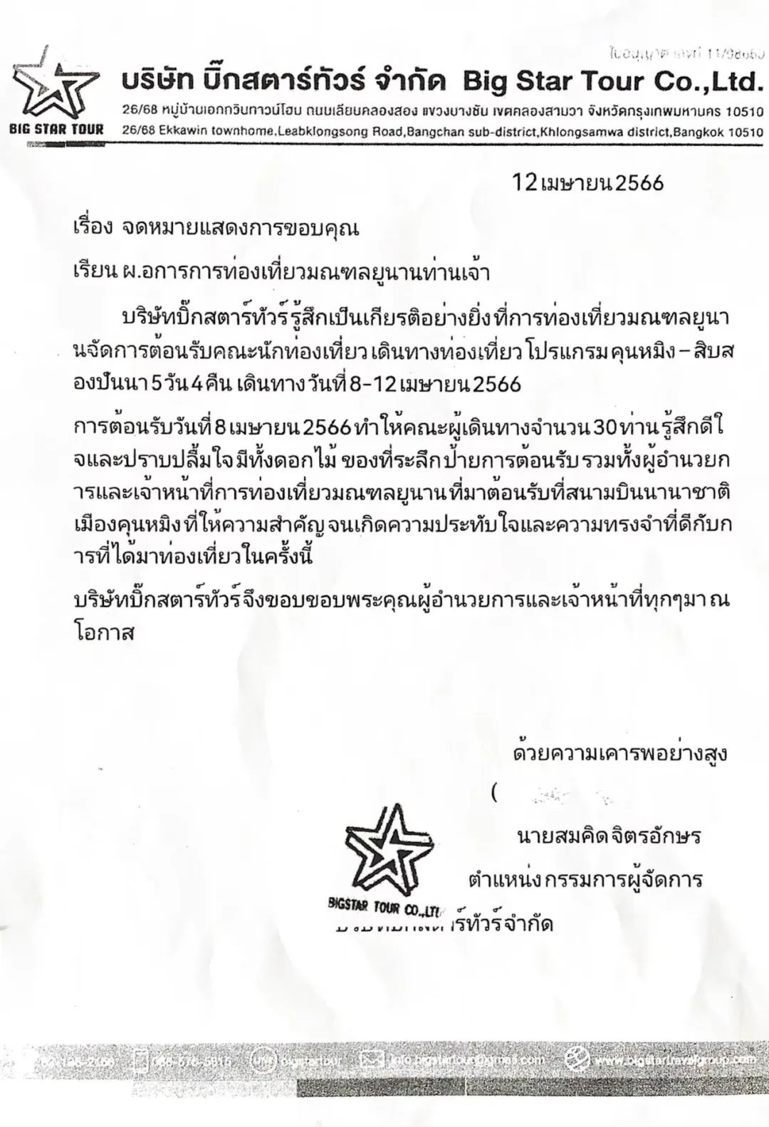 泰國旅行社感謝信