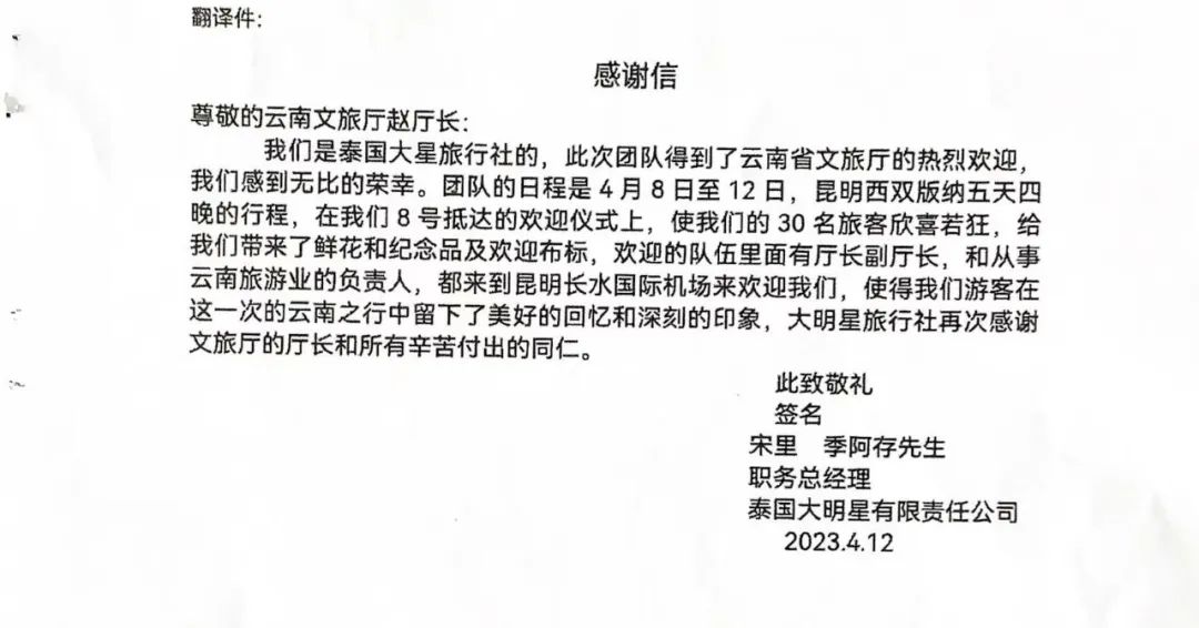 “在這四晚五天的云南之行中,我們無時無刻不心懷感激感恩之情,此次旅途給我們留下了深刻的印象。開心快樂一路相隨,云南的風景美、人更美,一路上遇到的人,對待外國游客是多么的友善和可愛?!比涨?,一封寫有30位泰國游客名字的感謝信送到云南省文化和旅游廳,字里行間中透露著真摯情感和濃濃的感謝之意,傳遞著泰國游客對云南的喜愛,對云南之行的滿意……