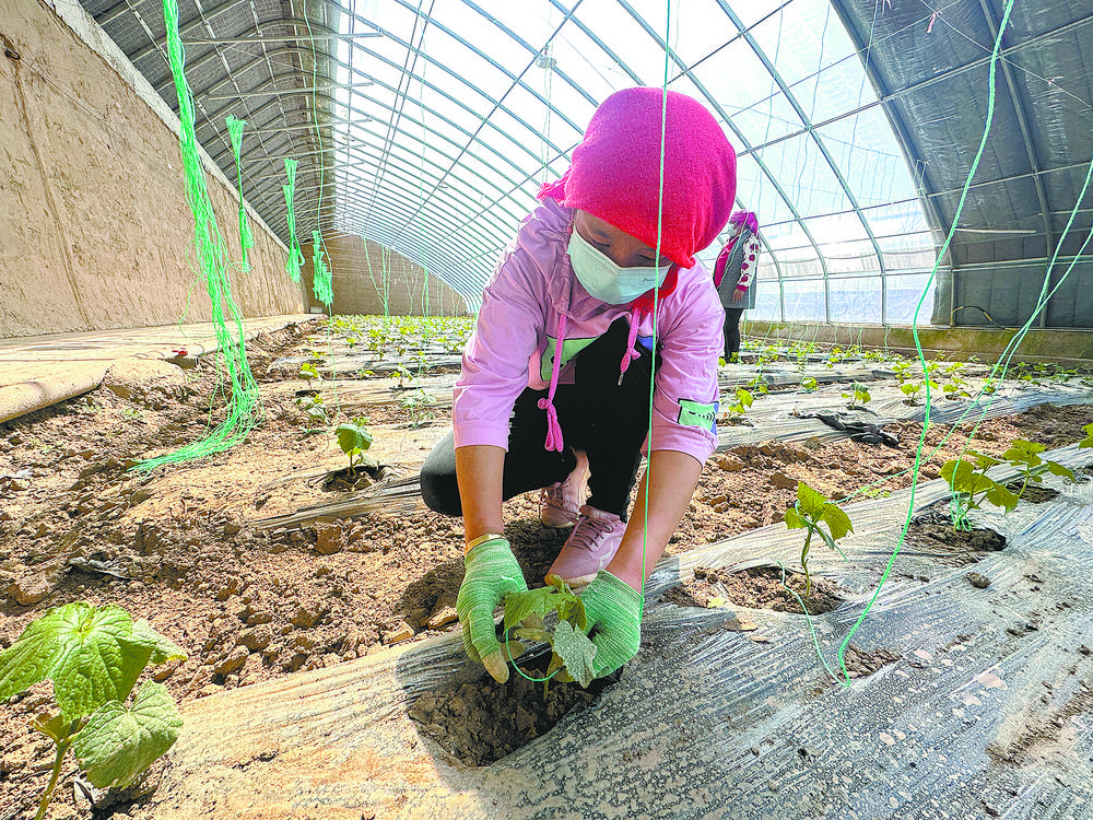 看到童有玉姐妹時(shí),四個(gè)人正在大棚里忙著給黃瓜吊秧。半個(gè)月前落地的黃瓜苗,已經(jīng)有一拃多高。