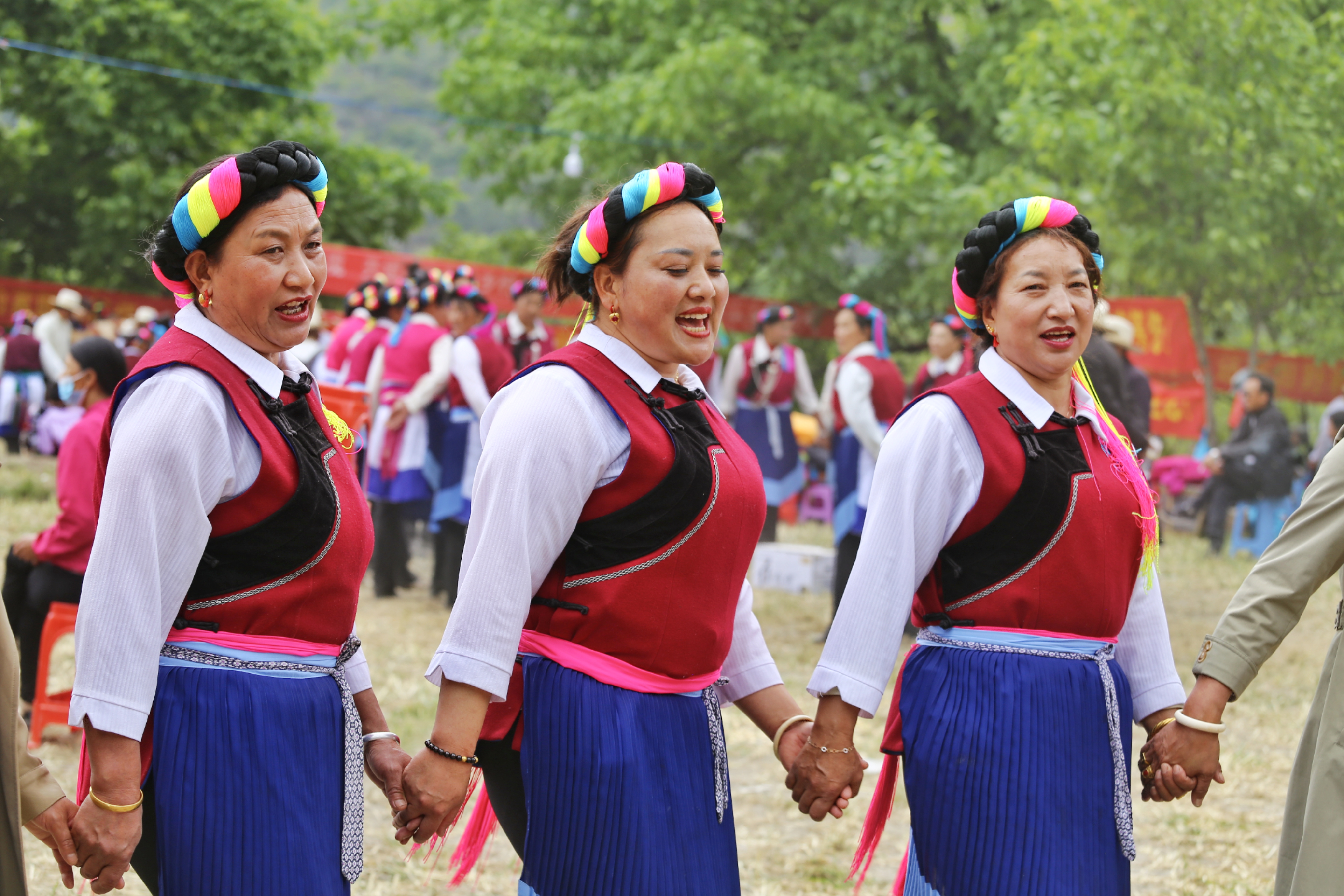 藝術(shù)節(jié)開(kāi)幕式上,《最美的歌兒唱給黨》《傳統(tǒng)熱巴》《編雙草鞋送紅軍》《犁田調(diào)》《遇見(jiàn)卓瑪》等節(jié)目向觀眾展示了其宗厚重的文化底蘊(yùn)和村民生活的變化。伴隨著悠揚(yáng)的歌聲,“四縣”各族兒女手挽手、肩并肩,圍成同心圓共舞“千人鍋莊”,水袖揮舞,褶裙搖曳,場(chǎng)面壯觀,游客們紛紛拿出手機(jī)記錄這場(chǎng)視覺(jué)盛宴。