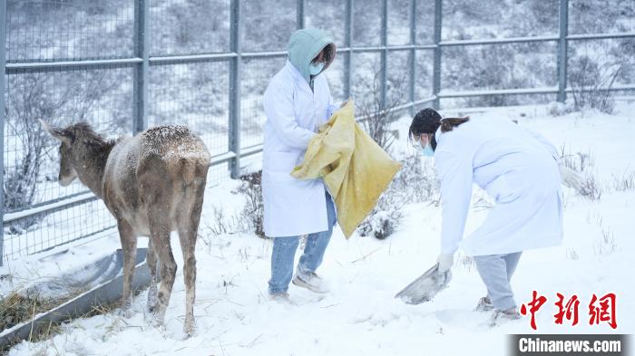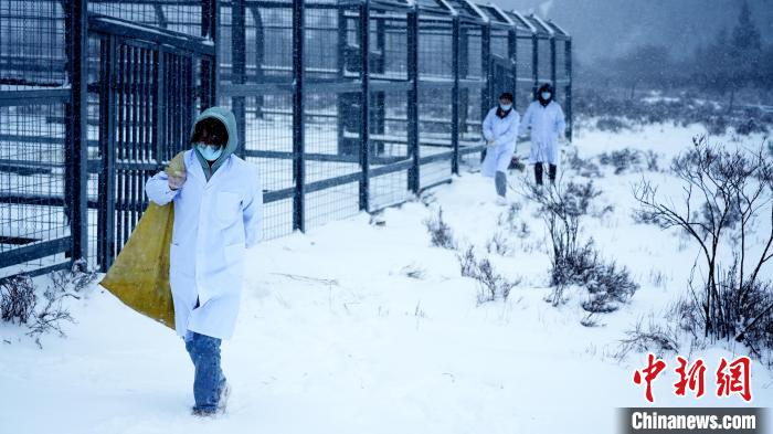 圖為頂風(fēng)冒雪工作的野生動物救護繁育員。包雷 攝