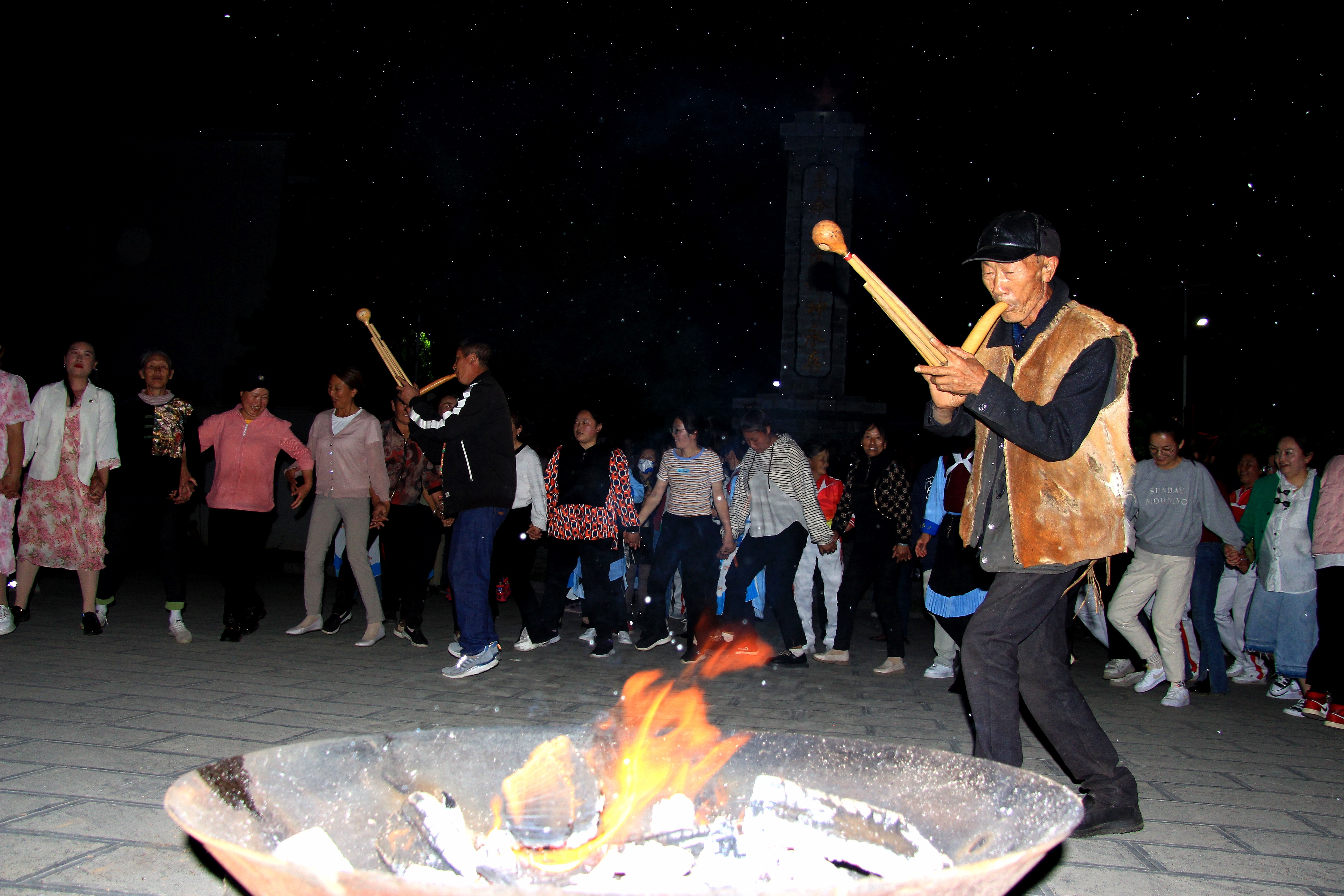 打跳開始了,不斷有圍觀群眾參與到打跳當(dāng)中,打跳選手手牽手把篝火圍了三四圈,篝火的映照下,大家臉上的笑容又燦爛了幾分。打跳歌曲從勁爆葫蘆絲換到納西三部曲又換到大蠻調(diào),換了無數(shù)首,而參與群眾仿佛不知疲倦一直激情打跳著,現(xiàn)場(chǎng)非?;馃帷?/p>