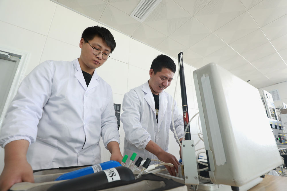 4月6日,瓦里關(guān)本底站觀測員時聞(左)和楊昊(右)在準(zhǔn)備開展氣瓶采樣。新華社記者 李占軼 攝