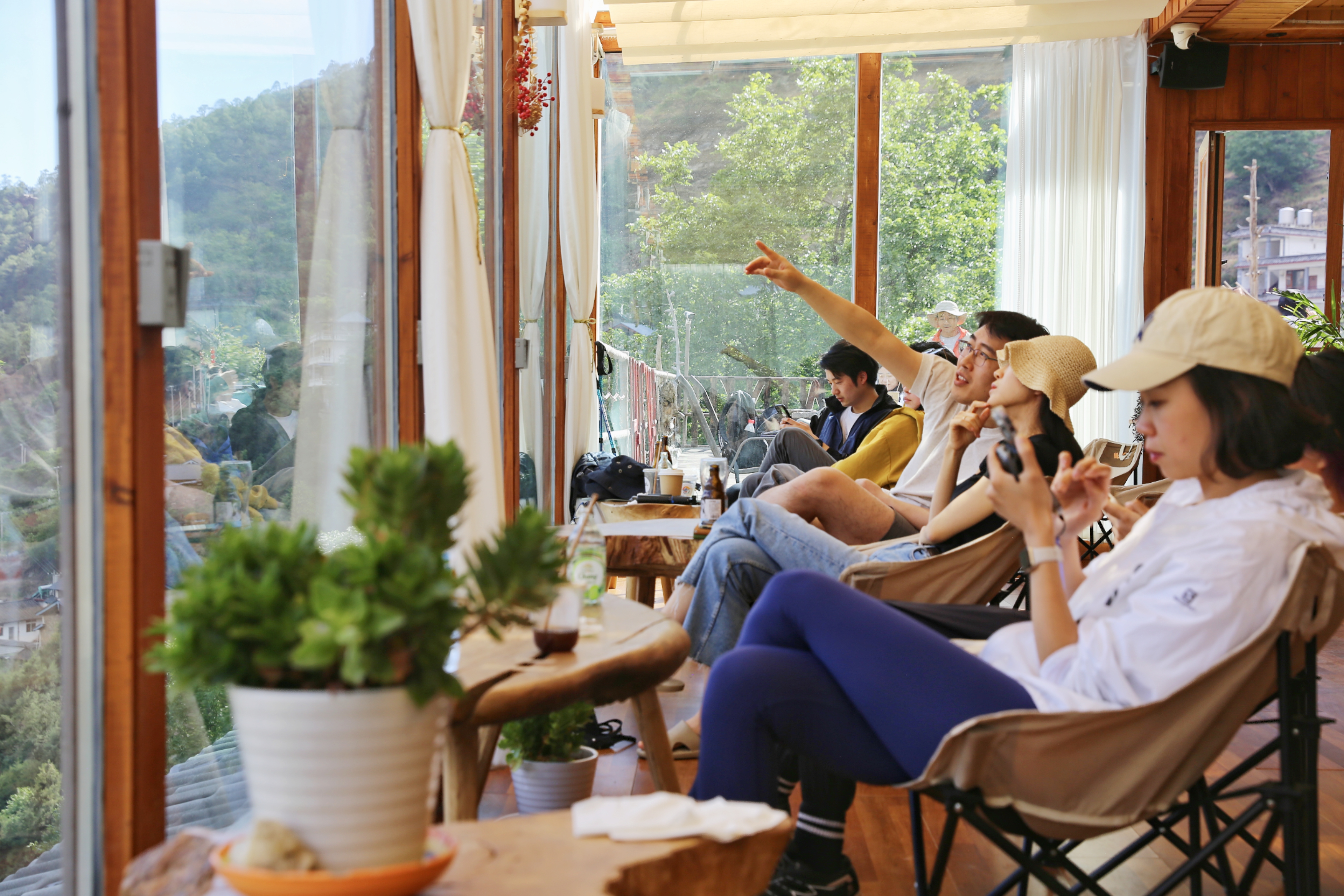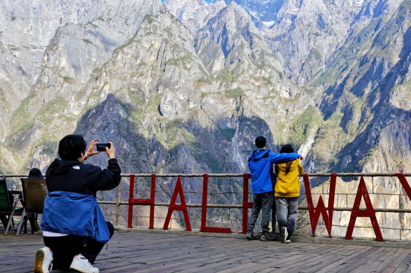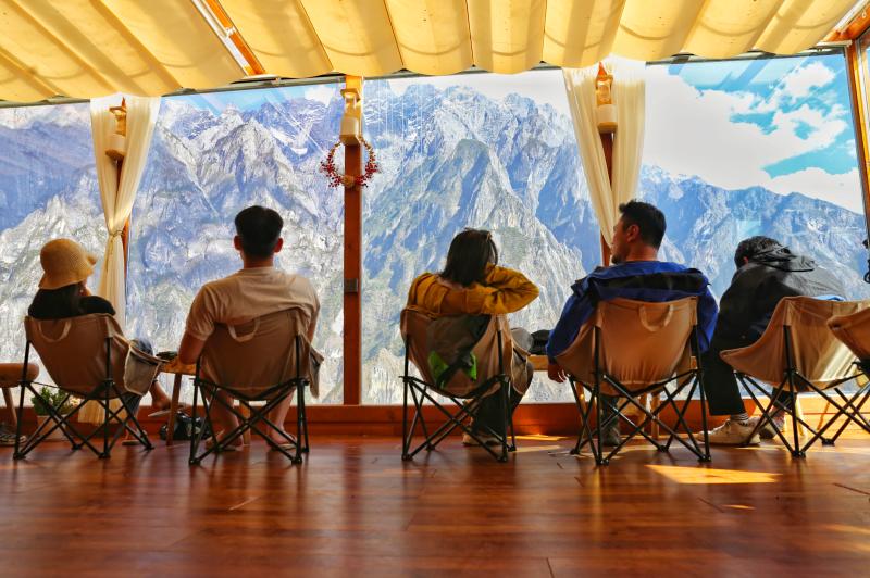 5月17日,游客在香格拉里市虎跳峽高路徒步線路中途客棧小憩,欣賞雪山峽谷壯美景色?;⑻鴯{高路徒步路線為“世界十大經(jīng)典徒步路線之一”,全長20公里左右,該路線以險(xiǎn)、奇、秀著稱。路線位于哈巴雪山山麓,腳下金沙江水奔涌而過,對岸是聳立入云的玉龍雪山,一路叢林、峽谷、古道、瀑布等景色美不勝收,每年吸引著數(shù)萬名國內(nèi)外的驢友來此徒步。