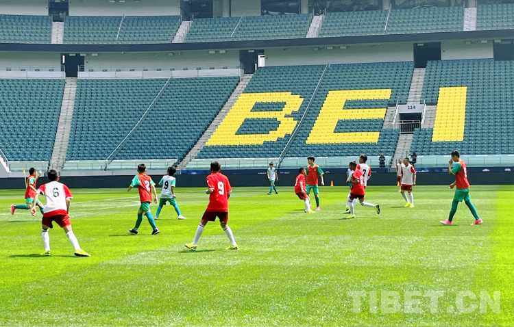 圖為玉樹少年們?cè)诠と梭w育場(chǎng)與北京國(guó)安少年足球隊(duì)一起訓(xùn)練交流比賽 攝影:王茜