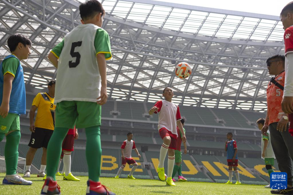6月1日,在北京工人體育場,藏族孩子與國安少年足球隊隊員訓練交流。新華社記者 才揚 攝