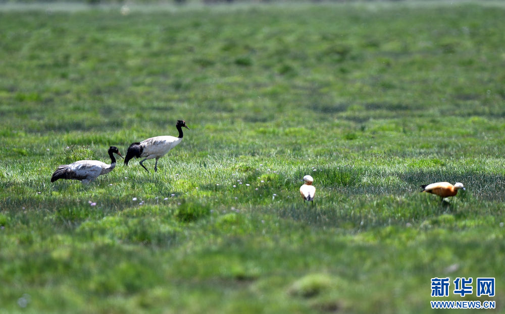 兩只黑頸鶴在青海隆寶國(guó)家級(jí)自然保護(hù)區(qū)內(nèi)活動(dòng)。新華社記者 韓方方 攝