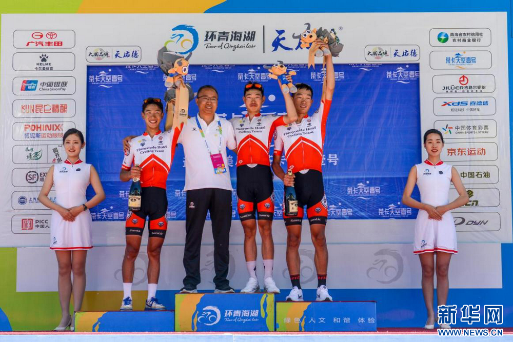 運(yùn)動(dòng)員手拿吉祥物站在環(huán)湖賽領(lǐng)獎(jiǎng)臺(tái)。環(huán)湖賽組委會(huì)供圖。