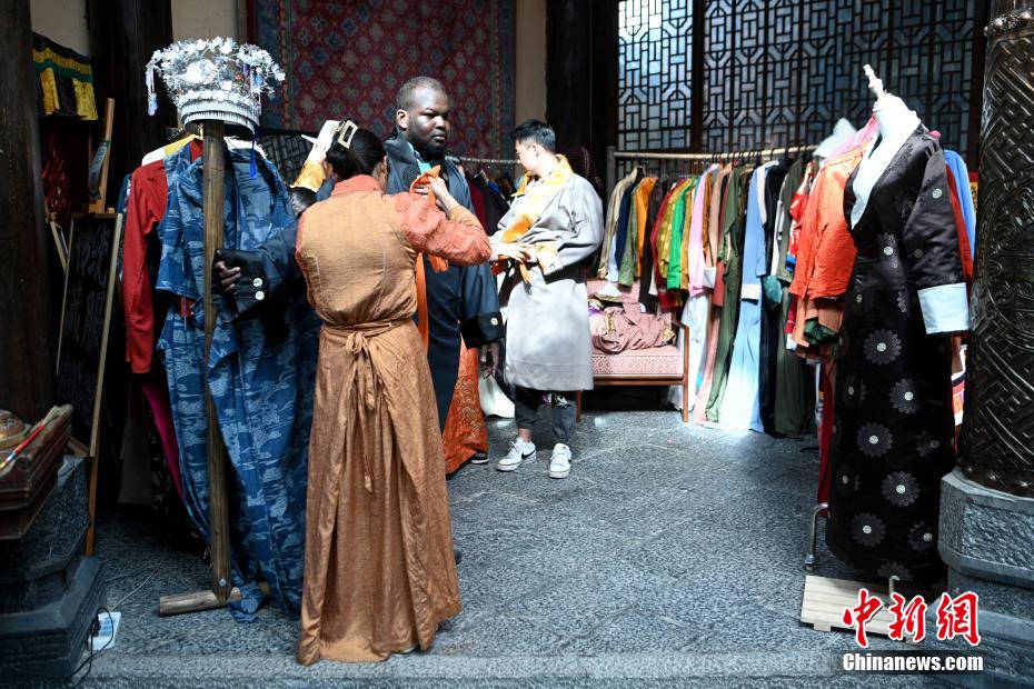 工作人員幫助“Z世代”青年試穿藏族服飾。李嘉嫻 攝