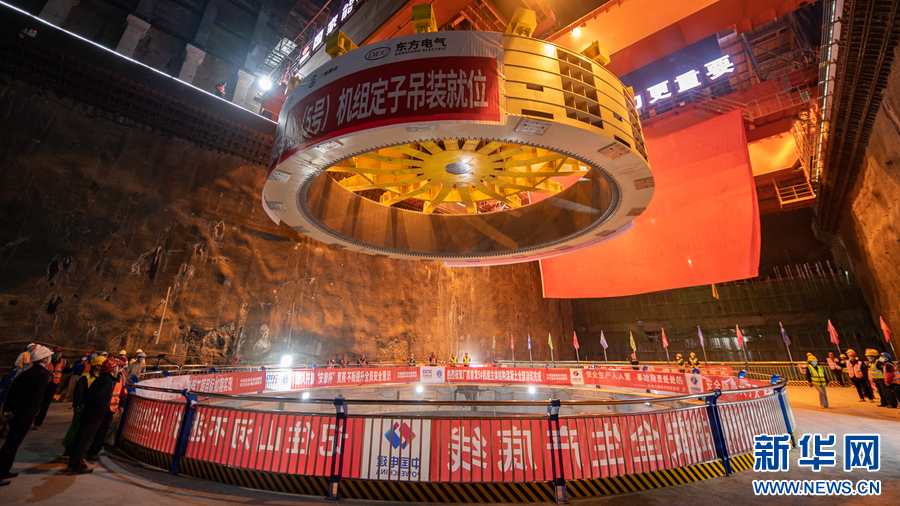 6月30日,瑪爾擋水電站地下廠房?jī)?nèi),工作人員正在進(jìn)行首臺(tái)機(jī)組定子吊裝作業(yè)。新華網(wǎng) 潘彬彬 攝